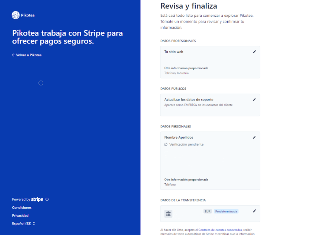 Una vez le des a Listo, tu cuenta quedará vinculada con Pikotea y serás redirigido a la web de administración. Aquí podrás ver que se ha enlazado correctamente si ves el apartado de Plataforma de pago Stripe de la siguiente forma.