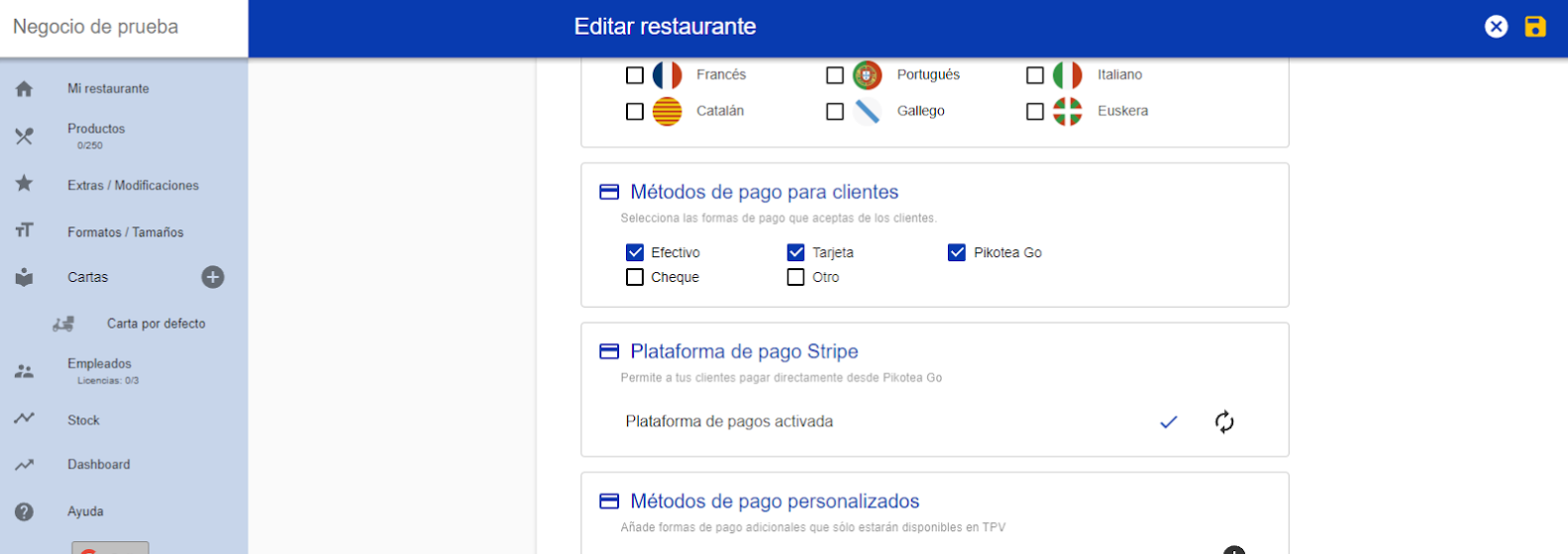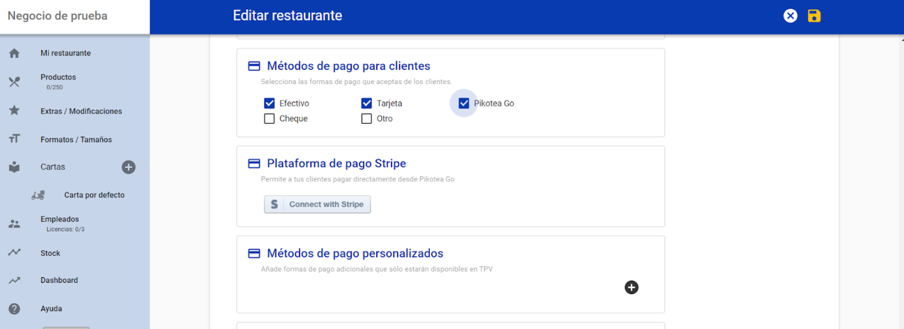 Lo primero que debes hacer es activar el método de pago para clientes “Pikotea Go” en la web de administración. Puedes ver más información aquí. Tras activarla, te aparecerá una opción, justo en la parte inferior, en la que indica Plataforma de pago Stripe.