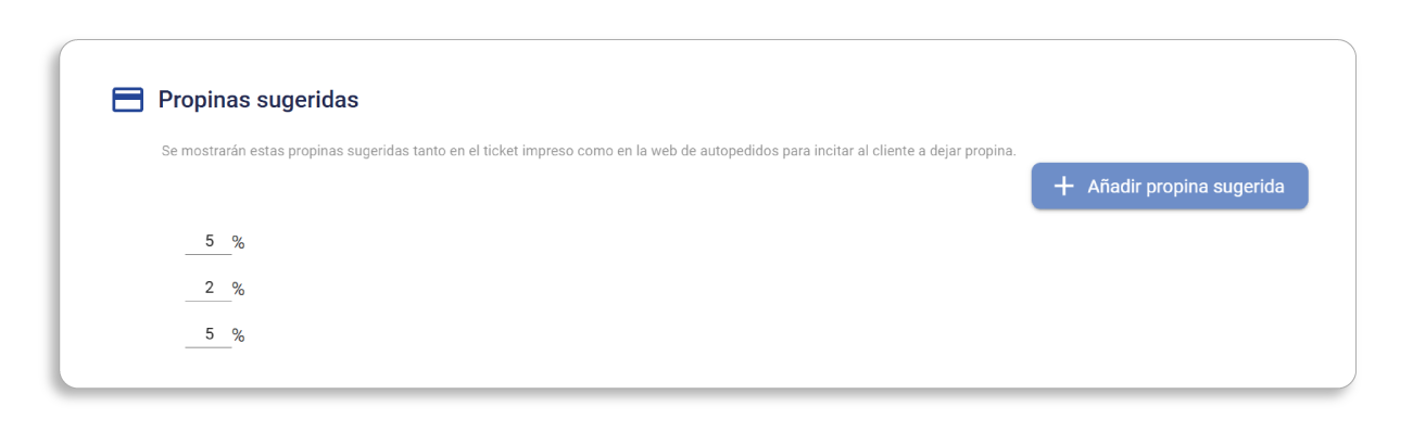 En esta sección te damos la opción de poder sugerir una propina a tus comensales. Puedes añadir hasta 3 opciones dándole al botón "+". O eliminando alguna opción pulsando sobre la papelera que verás justo en su lateral.