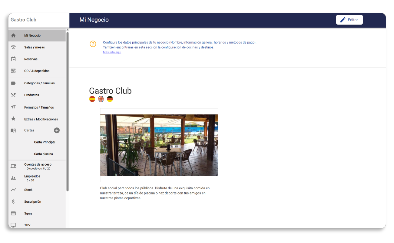 Una vez iniciada sesión en la Web de Administración, encontrarás la pantalla de información del negocio "Mi Negocio". Aquí se muestra un resumen de la configuración.