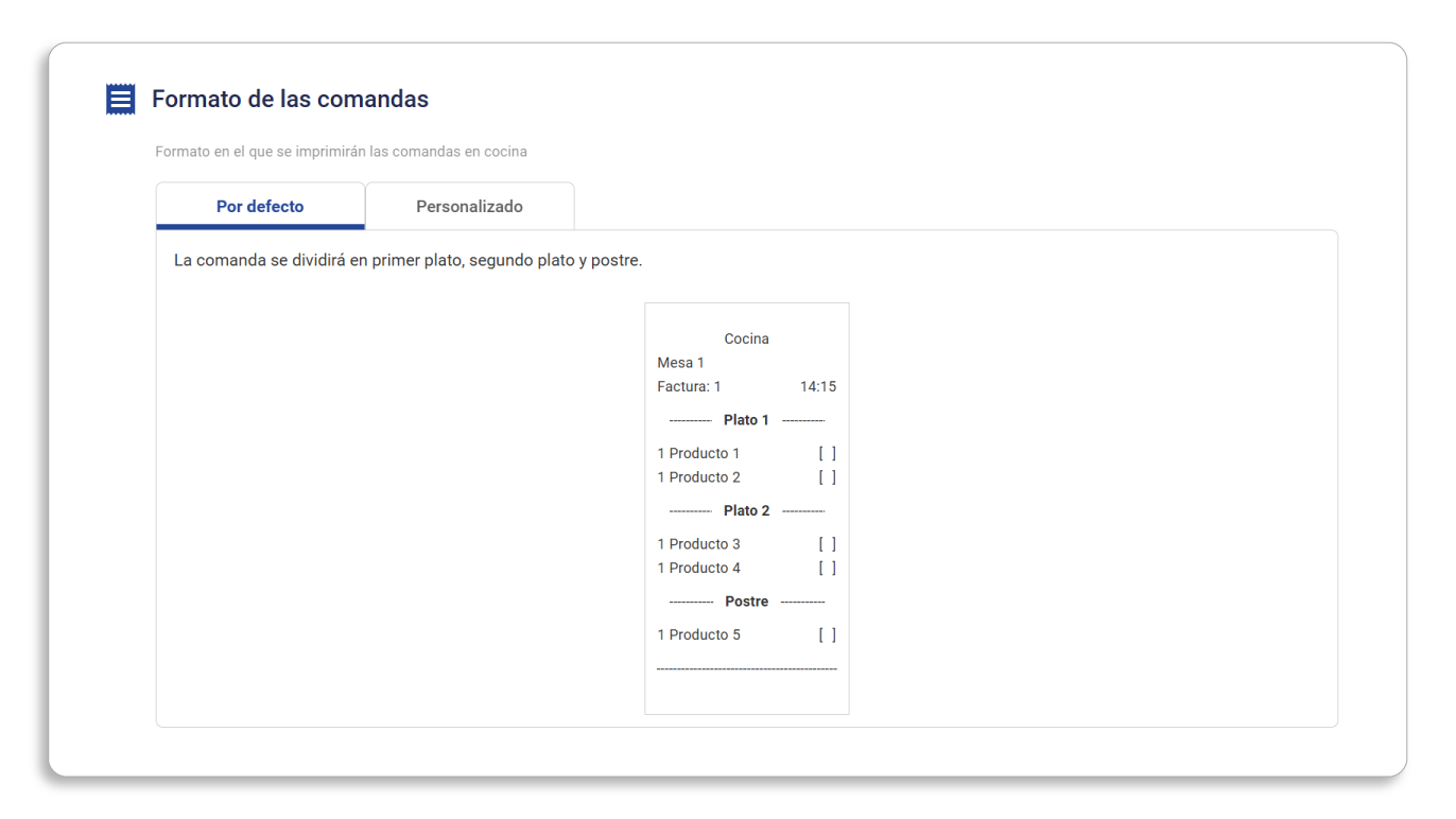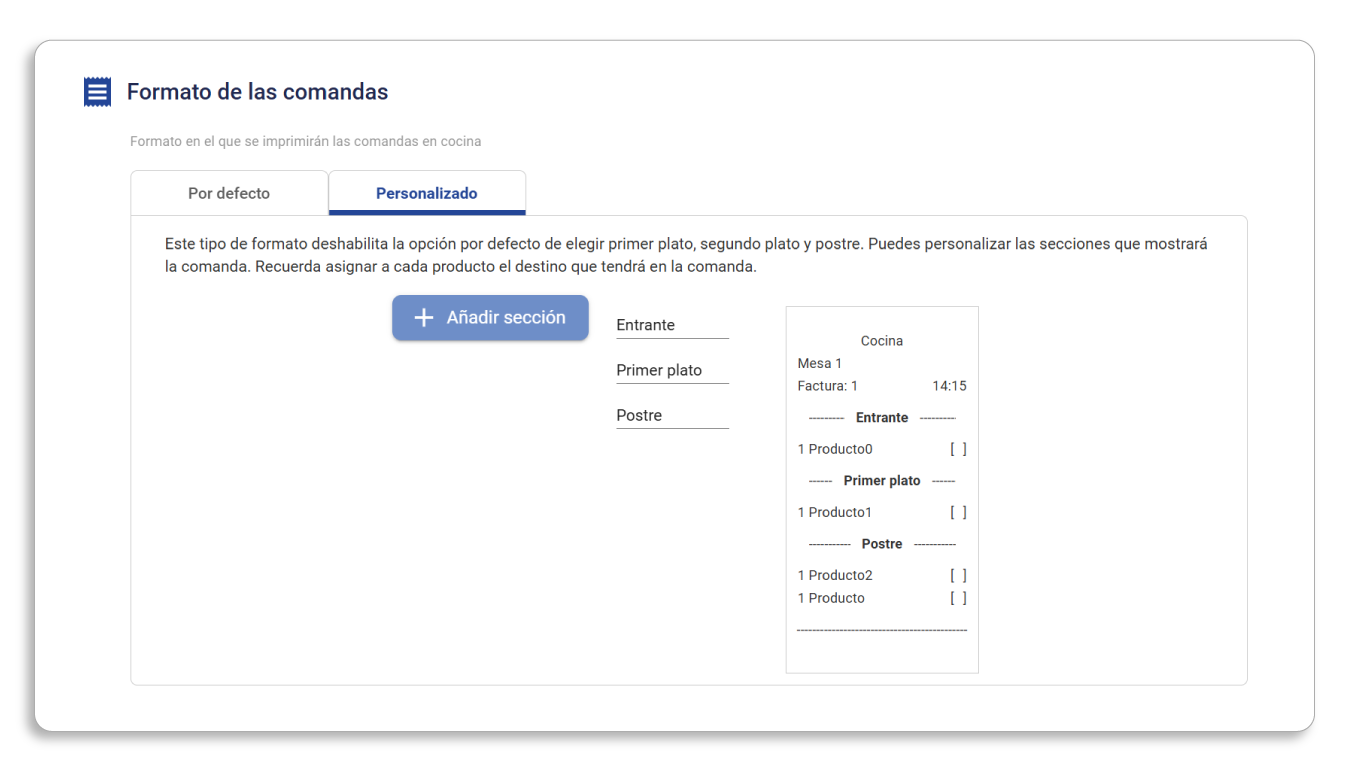 En esta sección podrás editar la forma en la que se presentan las comandas tanto en las pantallas de cocina como en los tickets impresos.