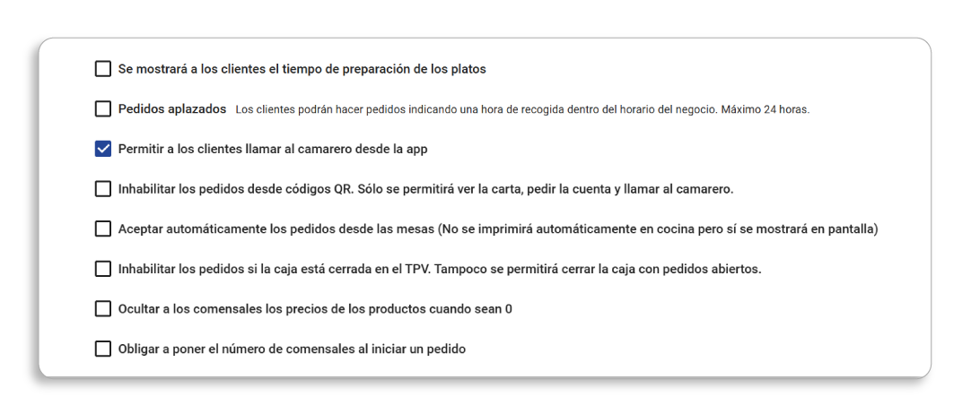 Inhabilitar los pedidos desde códigos QR: Si habilitas esta opción, tus clientes no te podrán hacer pedidos a través de los QR de las mesas, solo les estarás permitiendo ver la carta a través de ellos.