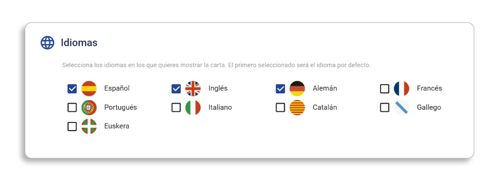 En esta sección podrás marcar los idiomas en los que quieres que tu carta esté disponible. Esto sirve para que, según el dispositivo que acceda a la carta, ya sean empleados en el TPV o comensales en el menú, se visualice con el idioma que tiene configurado dicho dispositivo. De esta manera, el comensal puede pedir con la carta en inglés y el cocinero, ver todo lo que se está comandando en español.
