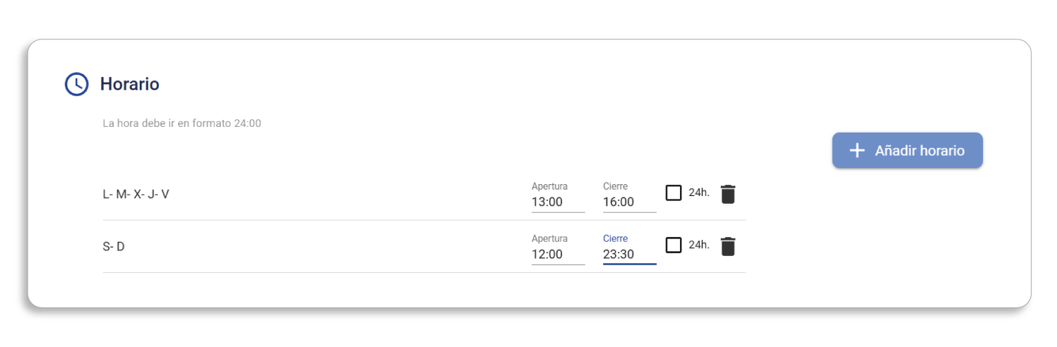 En esta sección podrás configurar el horario de tu local. Esta opción es muy versátil, ya que puedes poner diferentes horarios para diferentes días.