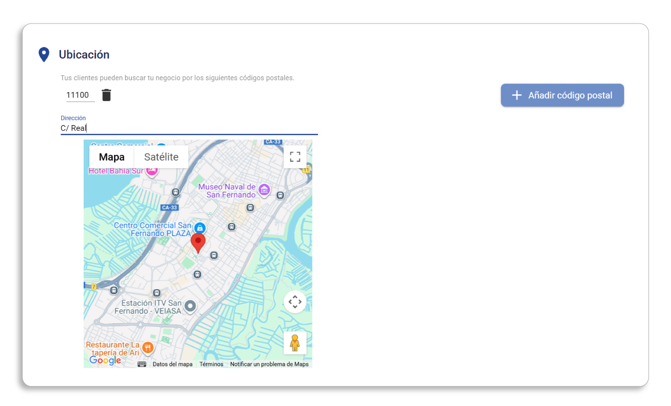 En la sección de Ubicación podrás establecer la dirección de tu local. También podrás añadir los códigos postales en los que aparecerás a los clientes a través de Pikotea GO.