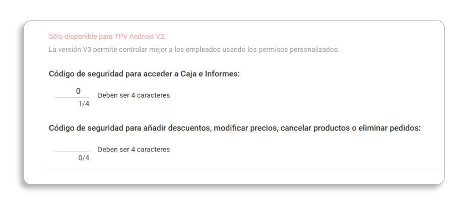 Nota: Estos códigos solo se puede utilizar en la versión 2 del TPV Android ya que se utiliza los permisos basados en roles (más info aquí). Si utilizas Windows, iOS o la beta en Android, puedes utilizar directamente los permisos personalizados para limitar las funciones de tus empleados.
