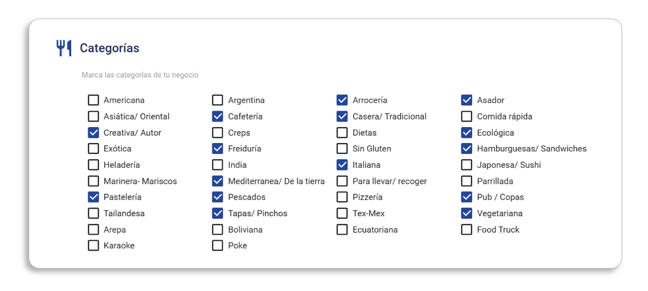 En esta sección podrás indicar las categorías a las que se dedica o se especializa tu negocio. Esta información se mostrará a los clientes cuando te busquen en Pikotea GO.